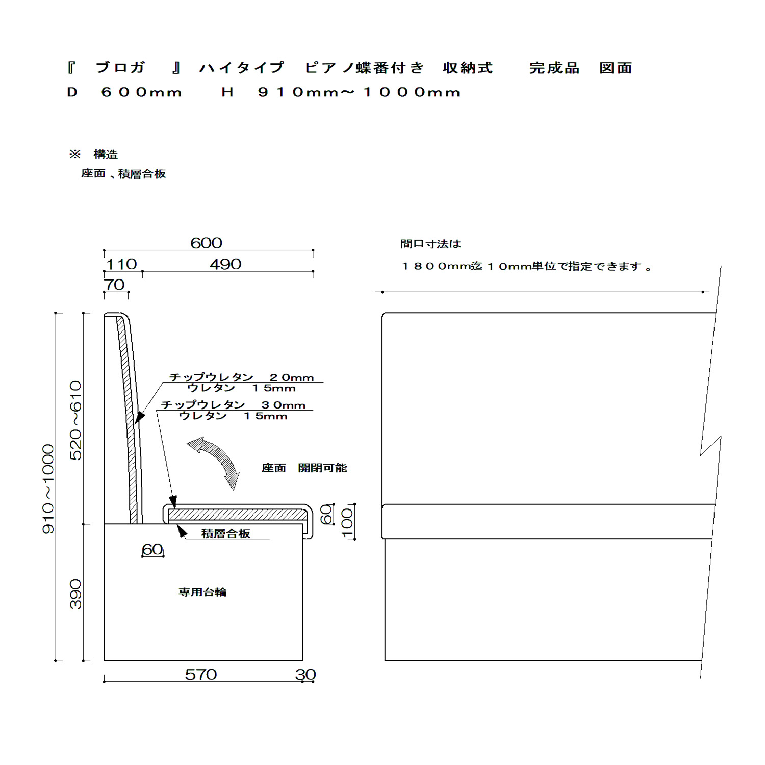 収納型/ D600×H910〜1000 背裏無し(ECOタイプ) 台輪3面仕上げ 価格表![]() (ベンチ上部 背裏無し)